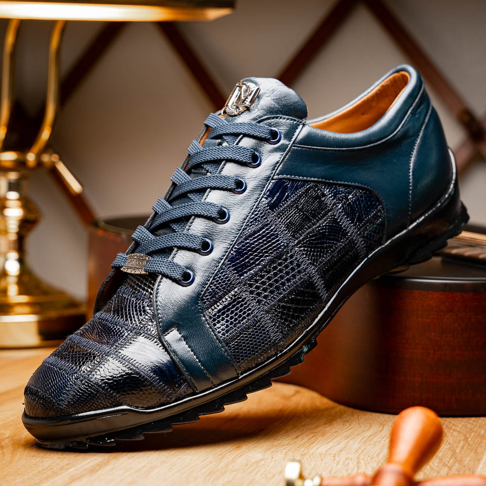 The BARI is our sporty genuine lizard fashion sneaker boasting a unique patchwork design, eye-catching rubber sole, and a hand painted finish. Dress these up with your favorite slacks for a sporty dress look or pair them with jeans or shorts for a casual but clean look.